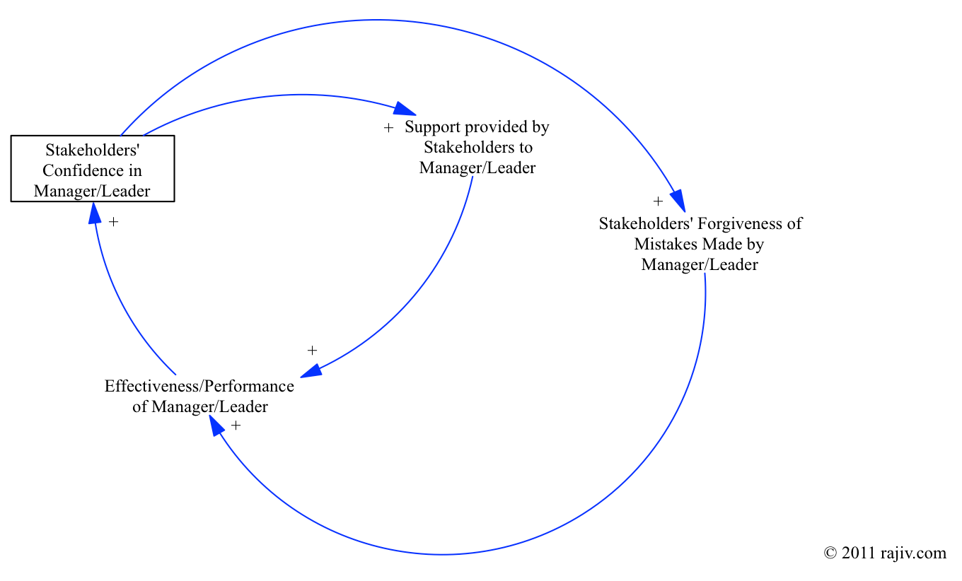 When stakeholders, executives and team members have confidence in the abilities of a leader/manager, it results in their lending greater support to that leader/manager. It also tends to make them more forgiving of mistakes made by the leader. Both of these things result in better performance, effectiveness and results from the leader. That, in turn causes the stakeholders, executives and team members to have even greater confidence in the abilities of the leader. This causal loop scenario is good for the leader’s career.