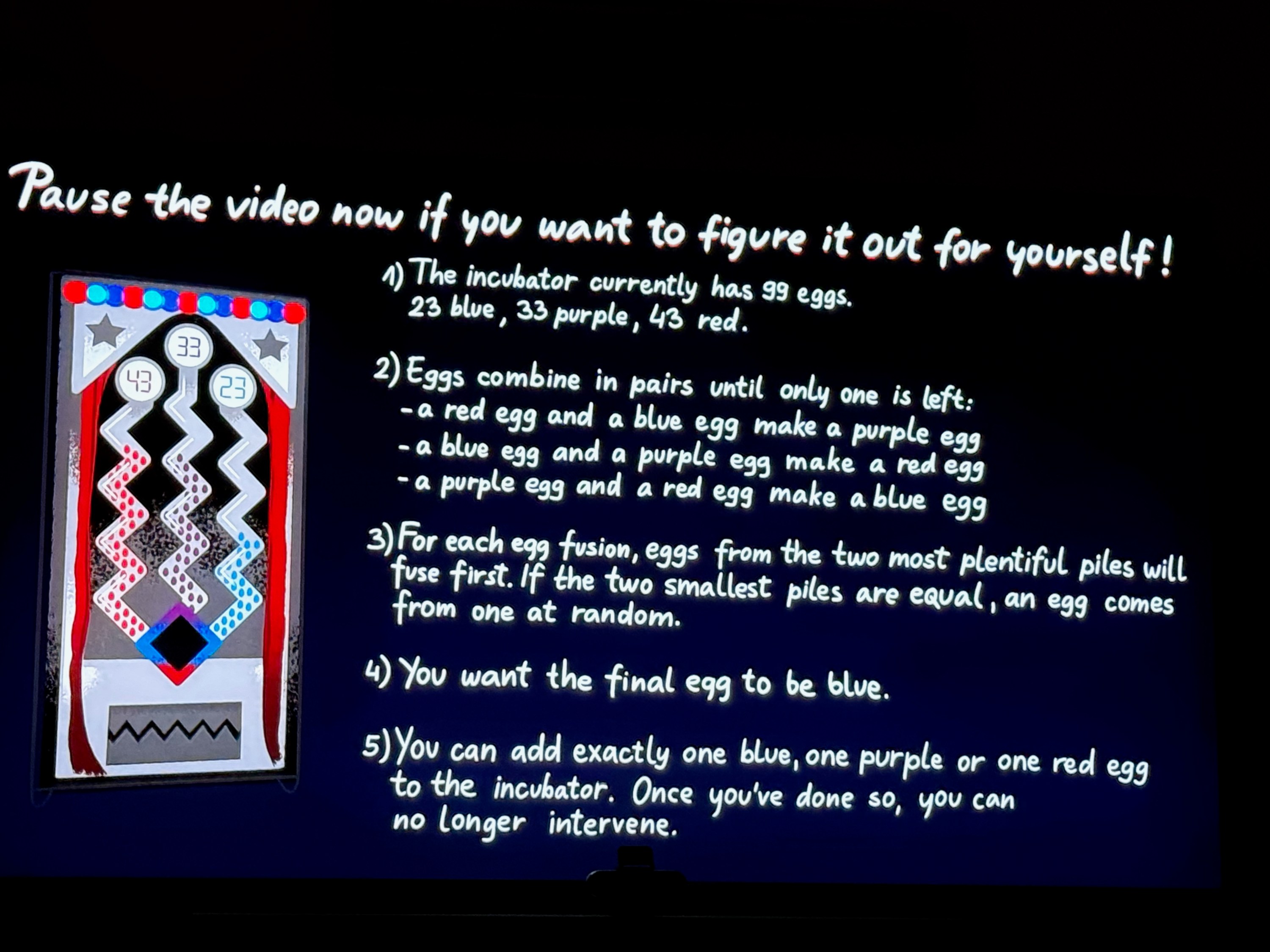The original puzzle, from a TED-Ed video (more info in my original blog post), presented an egg incubator with specific combination rules: red and blue eggs make purple, blue and purple make red, and purple and red make blue. Starting with 99 eggs (23 blue, 33 purple, 43 red), you can add exactly one egg of any color. The goal is to ensure the final egg is blue after all possible combinations are made.