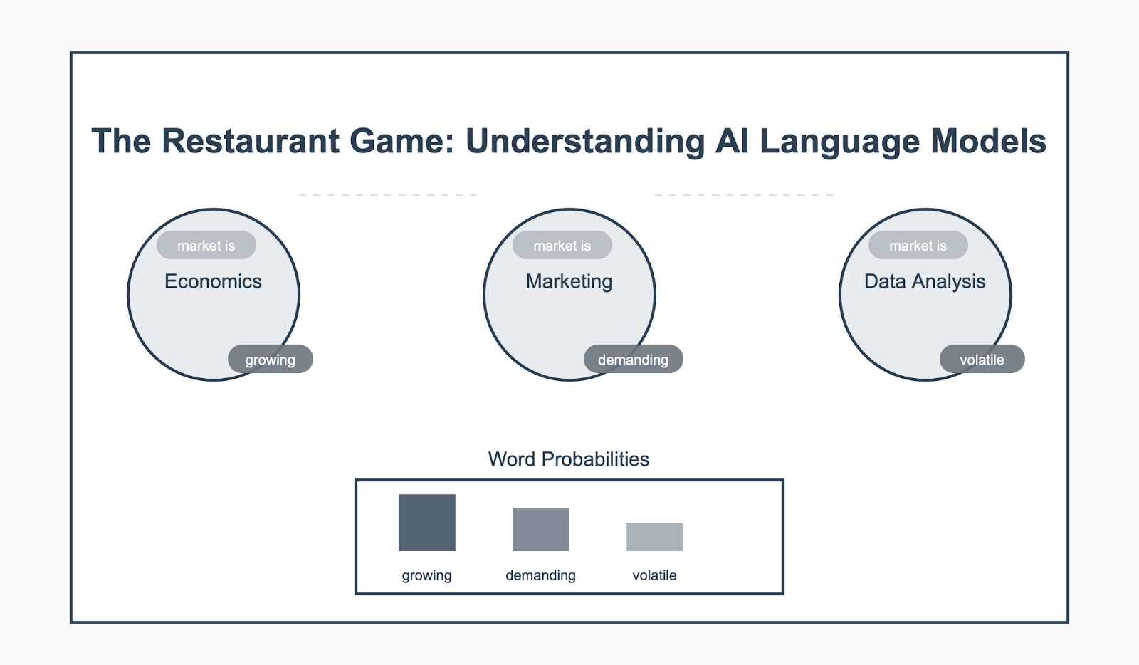 This collaborative prediction game mirrors how language models process and generate text. When GPT-4 or Claude encounters “The market is”, they too calculate probabilities based on their training data – much like our restaurant patrons draw upon their reading history. The key difference? The AI systems can process billions of examples simultaneously, while maintaining precise probability calculations for each possible next word.