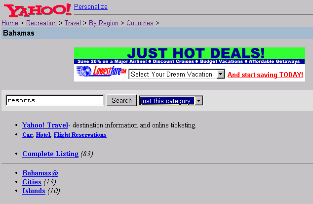 For an example of this, consider Yahoo. A user Alice who lives in Philadelphia wanted to travel to the Bahamas. She went to Yahoo and browsed to the category "/Recreation/Travel/By_Region/Countries/Bahamas/" as shown below.